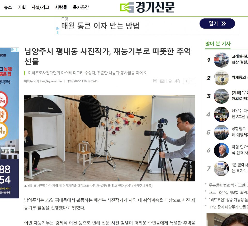 남양주시 평내동·호평동·금곡·마석 일대에서 오랫동안 활동해온 배선복 사진영상 대표는 지난 2007년부터 지역의 복지기관과 함께 꾸준히 가족사진 자원봉사를 이어오고 있습니다.